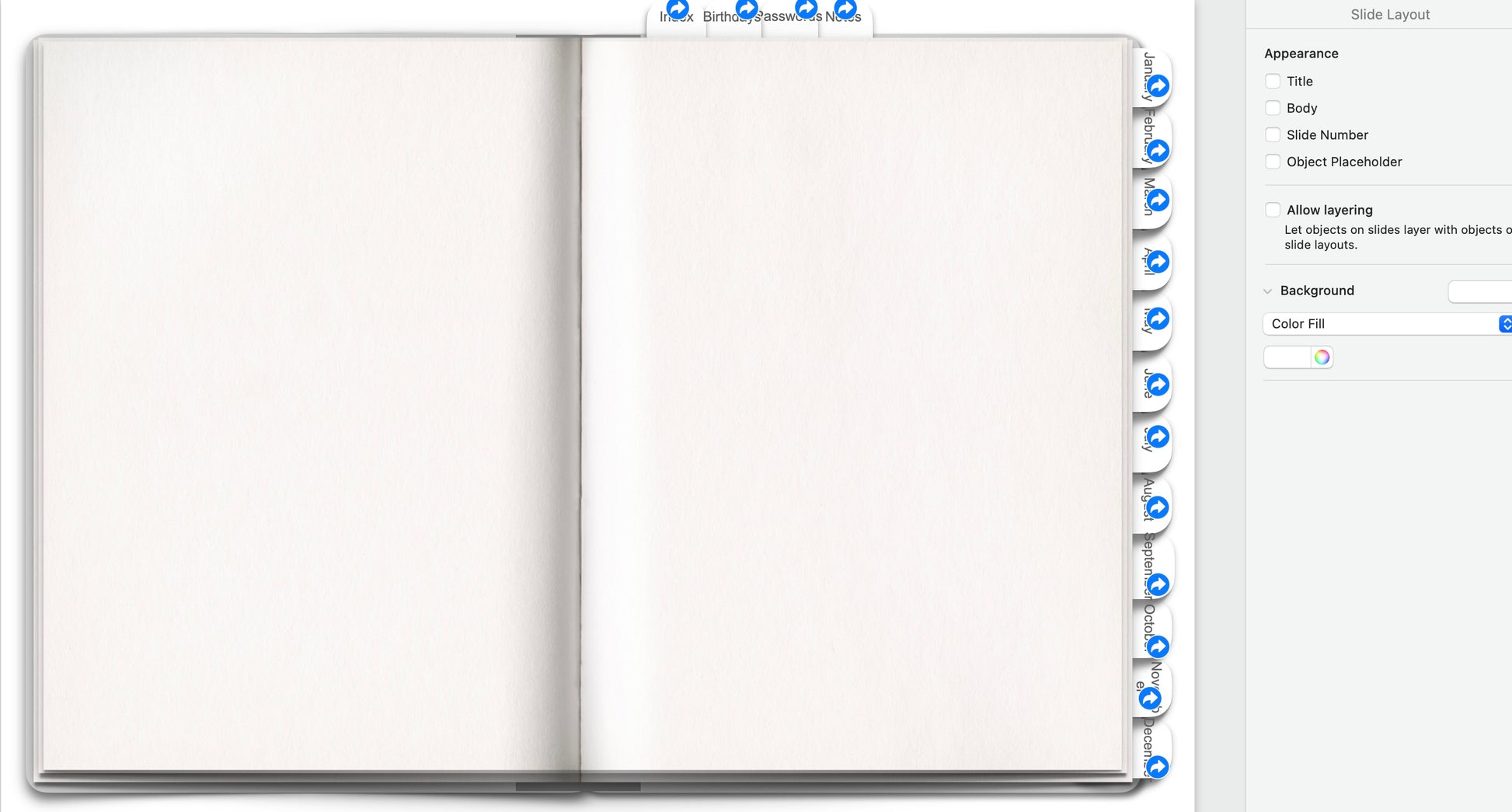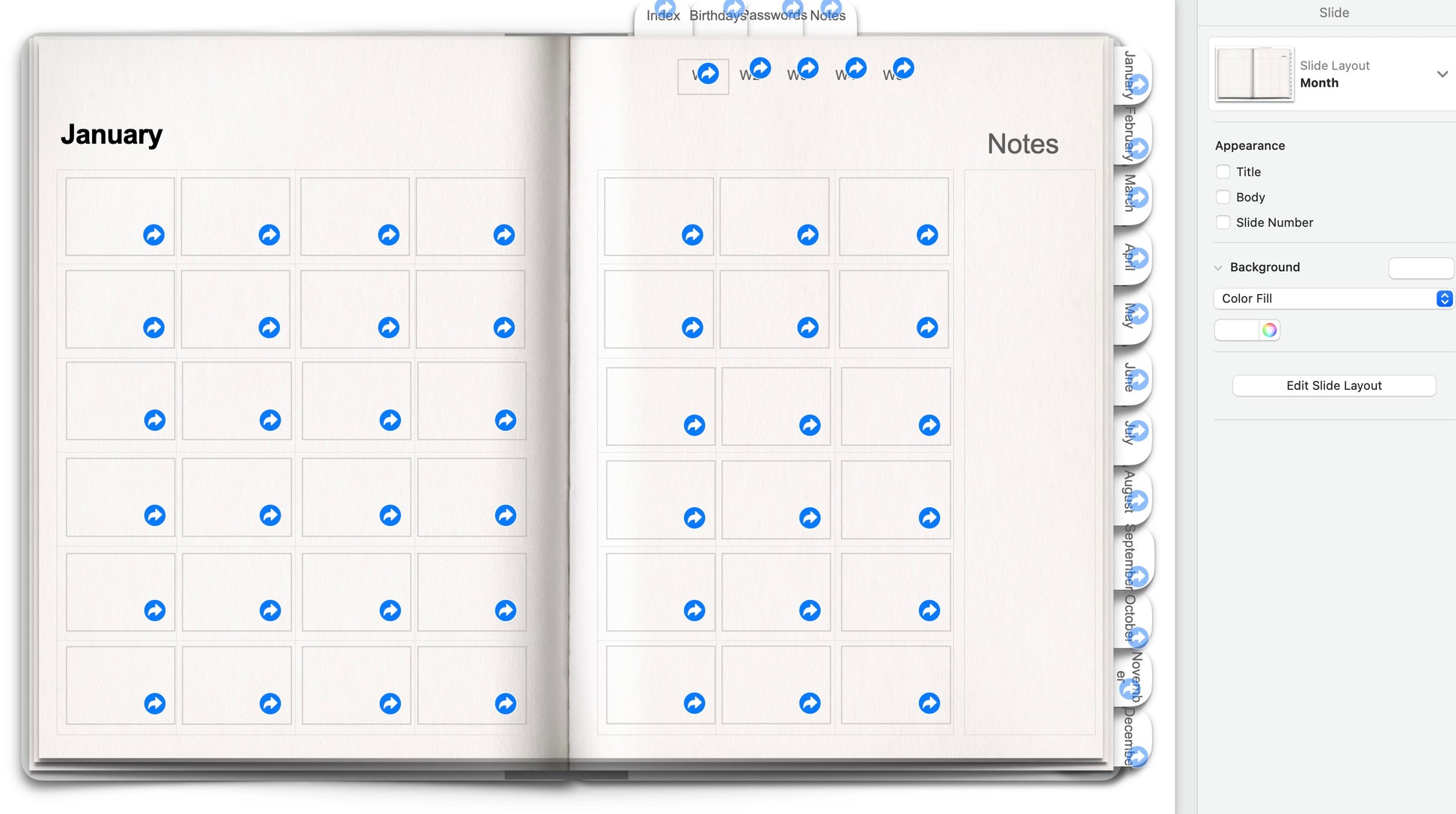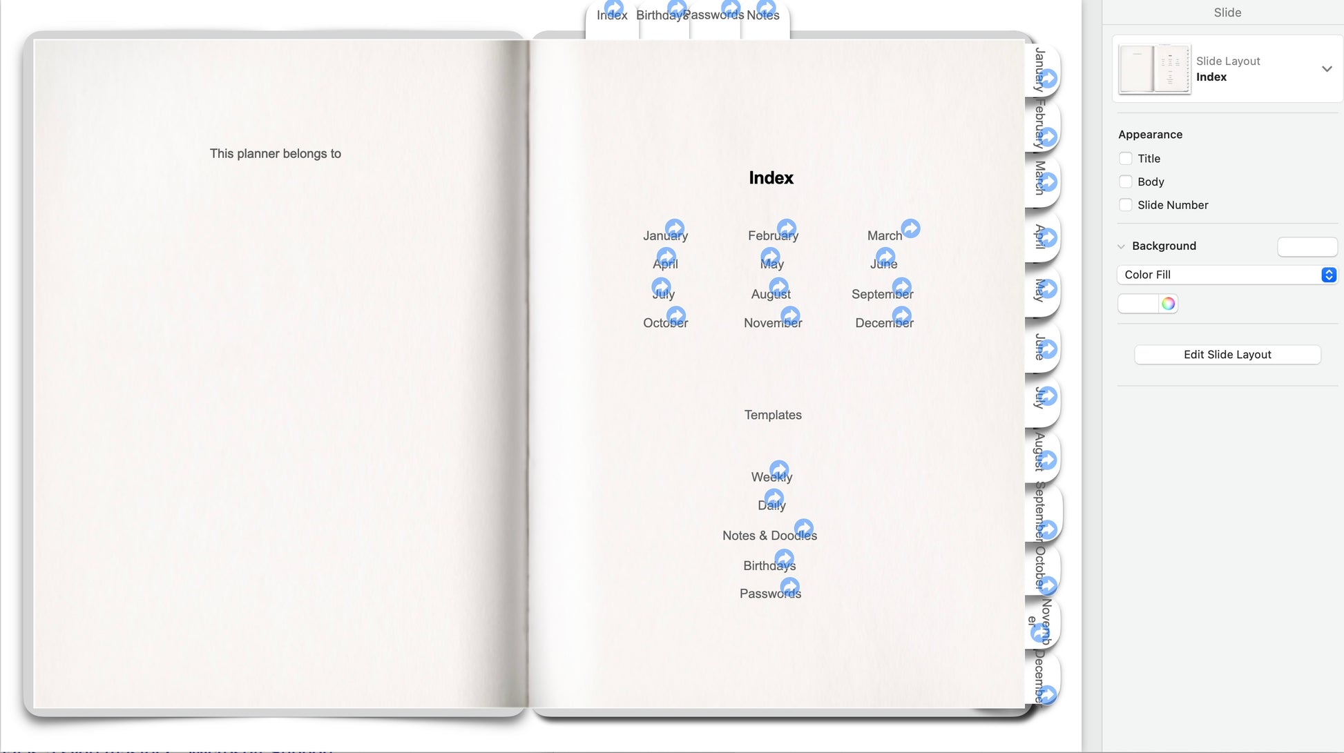 ⭐️ Slide layouts for index page, cover page, blank and monthly are included.