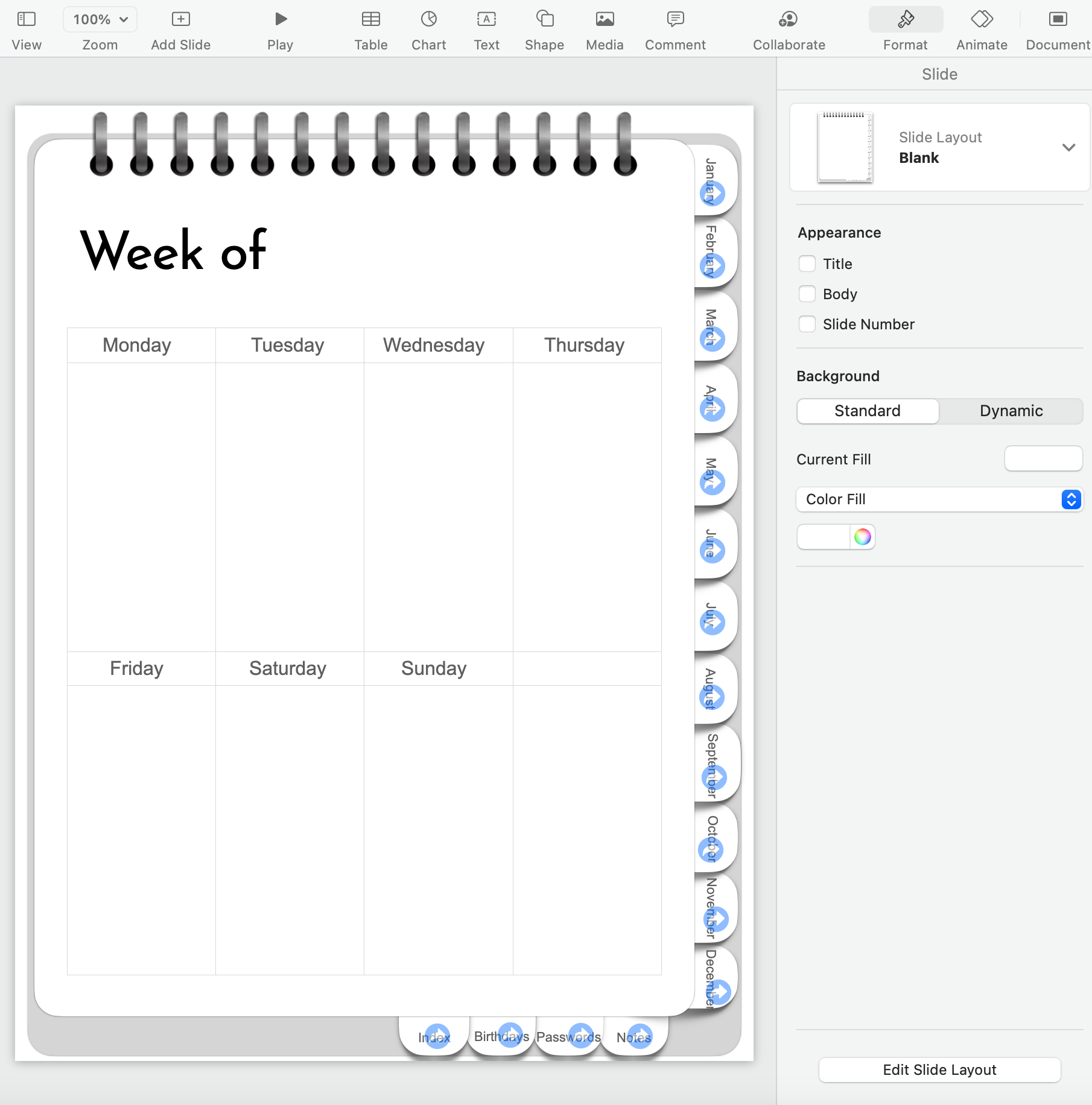 ⭐️ Slide layouts for index page, cover page, blank, weekly and monthly are included.