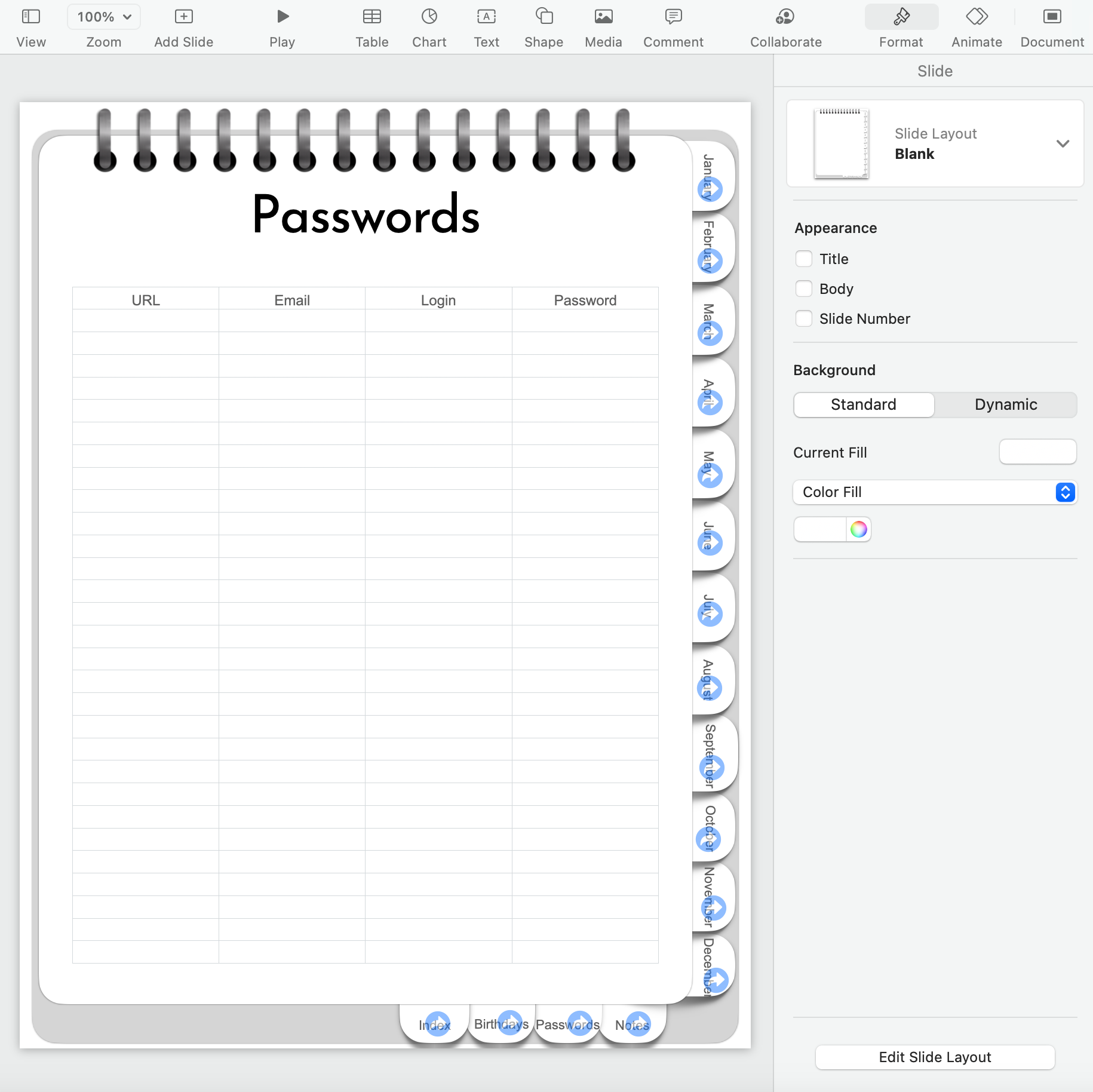 ⭐️ 3 extra tabs for passwords, birthdays and notes - or whatever you want to make!